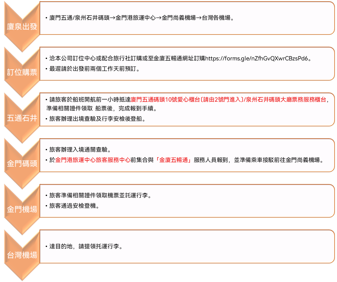 ● 請於出發前兩個工作天完成報名相關手續並傳訂單給金廈五暢通服務人員。
